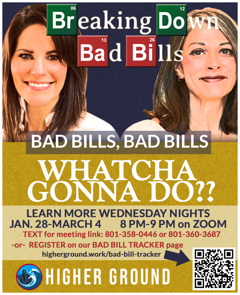 Join Natalie Cline & Monica Wilbur of Higher Ground, Wednesday nights starting January 28, from 8-9 on Zoom. You’ll get our unique take on which bills to watch out for, and more importantly, why they’re so dangerous.