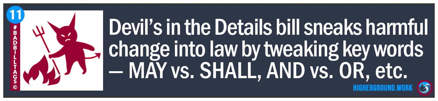 After studying lots of bills, we arrived at the conclusion that there are so many more ways to make a BAD BILL bad than to make a GOOD BILL good. As Matthew 7 says—For wide is the gate, and broad is the way, that leadeth to destruction.