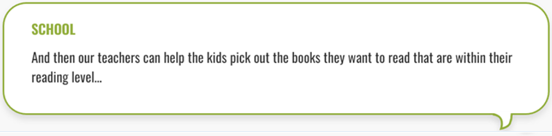 If the reading level is too hard, the child can simply choose the “Read to Me” option, indicating that books will be read by “engaging” with a device, rather than with a parent. They give lip-service to “parent-engagement,” but the parents don’t necessarily help select the books, and are told how to interact with their child. The portal, however, allows teachers, classroom aides, librarians, and reading specialists to log-in and assist the student in their “self-selection.” Any “engagement” between a parent and child in this reading program must be data-tracked through the app which has a log-in for the parent, separate from the student log-in.